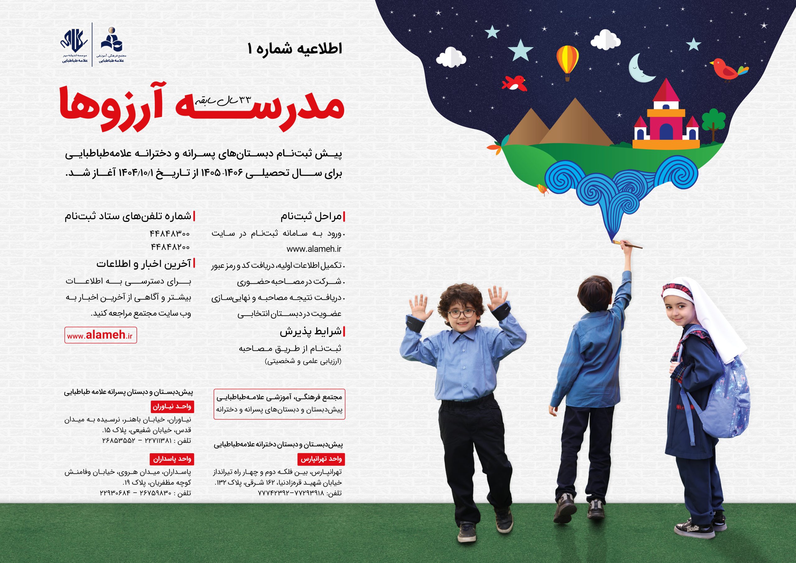 متقاضیان ورود به دبستان های مجتمع فرهنگی آموزشی علامه طباطبایی – واحدهای پسرانه نیاوران و پاسداران و واحد دخترانه تهرانپارس – می توانند مراحل پیش ثبت نام در پایه های اول تا ششم خود را در سایت alameh.ir آغاز کنند.