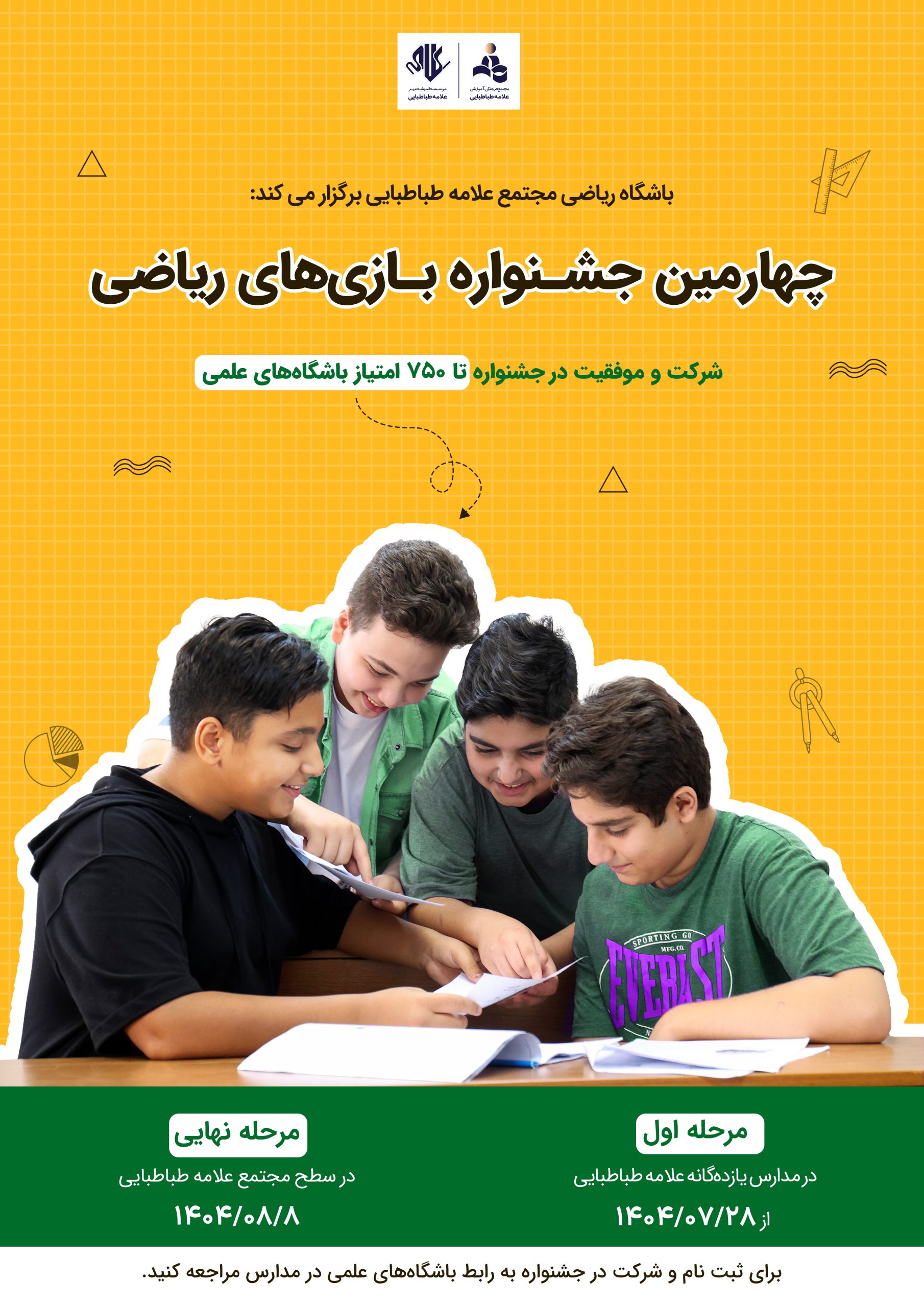 مرحلۀ مدرسه ای «چهارمین دوره جشنواره بازی های ریاضی» باشگاه ریاضی علامه ای ها، از ۲۸ مهرماه در مدارس یازده گانۀ علامه طباطبایی آغاز شد.